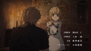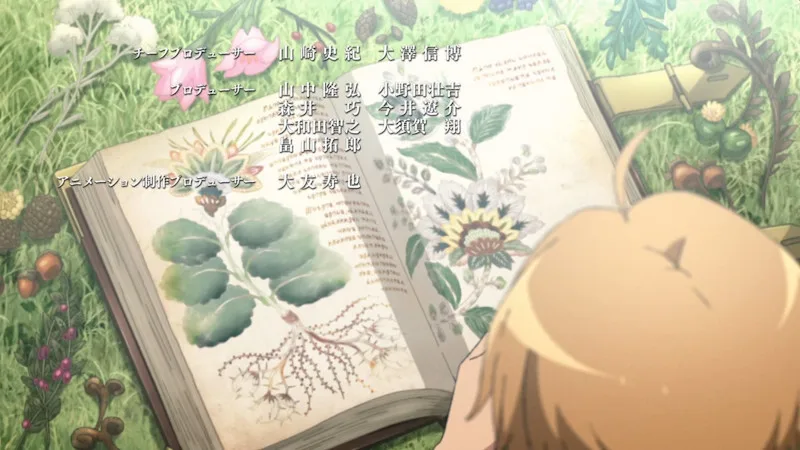 ロキシーのパンツを神棚のようにあおぐルディ、パウロとゼニスとの日常を経て、ようやくオープニングに入る。外に出て、村人に挨拶をし、ゼニスからのプレゼントである植物図鑑を片手に森に入るルディ。