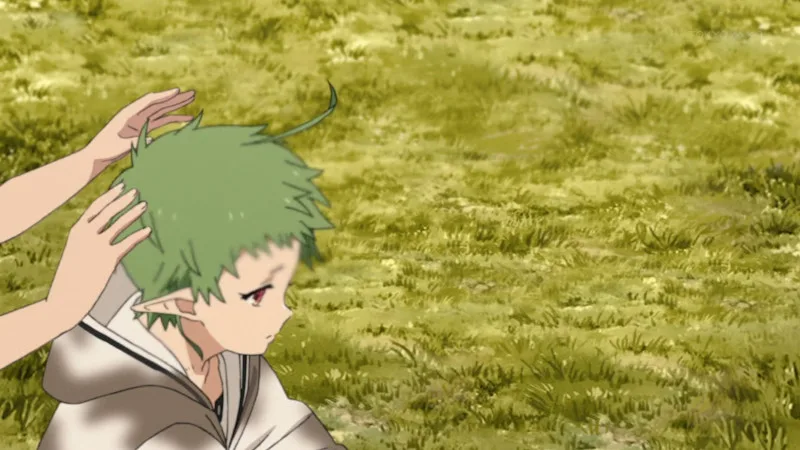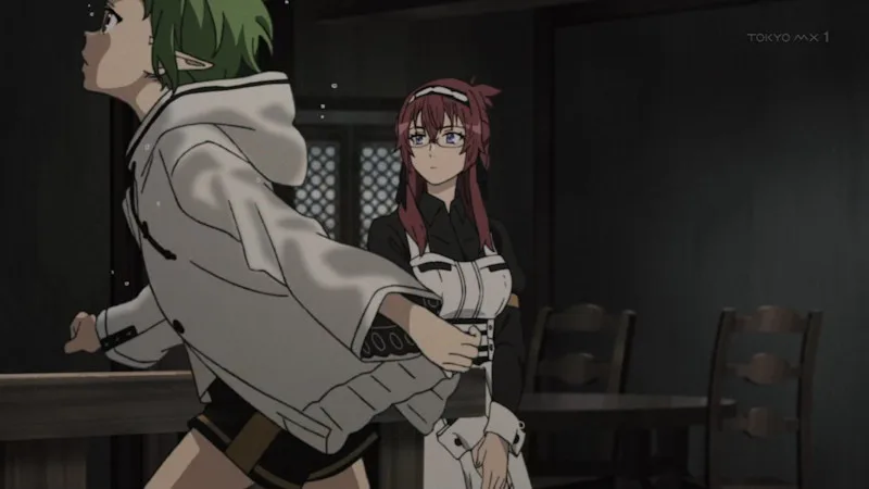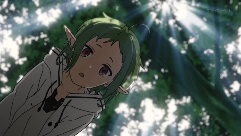 髪の毛の色が緑なので、魔族だと思うルディ。額に宝石なようなものがある魔族、スペルド族に気を付けろ、というロキシーの言葉を思い出すルディだったが、そうではないようだ。